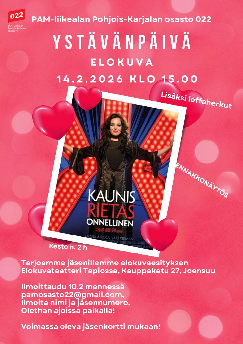 Ammattiosasto 022 tarjoaa jäsenilleen ennakkoesityksen Ystävänpäivän elokuvana - Kaunis, rietas, onnellinen - 14.2.2026, klo 15.00, Elokuvateatterikeskus Tapio, Joensuu. Elokuvan kesto n. 2 h…