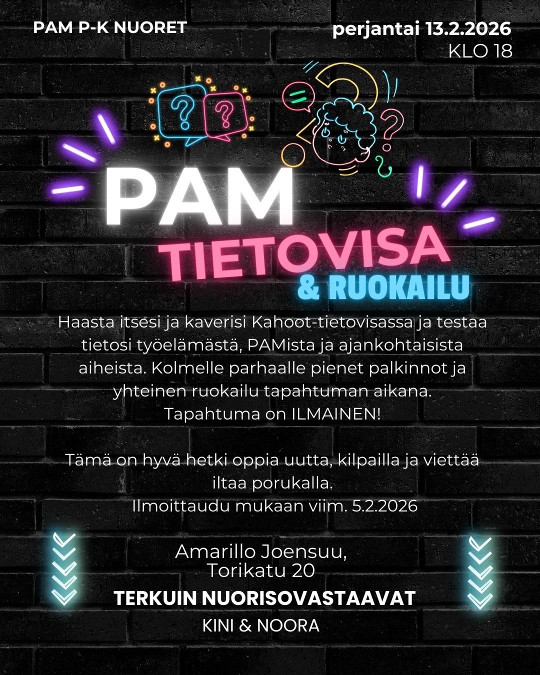 PAM P-K NUORET Hei, osastomme nuori jäsen! Haasta itsesi ja kaverisi Kahoot-tietovisassa ja testaa tietosi työelämästä PAMista ja ajankohtaisista aiheista. Kolmelle parhaalle pienet palkinnot ja…
