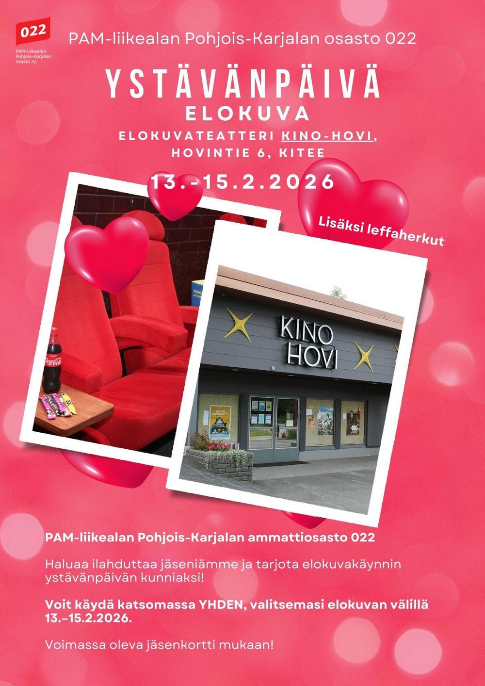 PAM-liikealan Pohjois-Karjalan ammattiosasto 022 Haluaa ilahduttaa jäseniämme ja tarjota elokuvakäynnin ystävänpäivän kunniaksi! + leffaherkut, ELOKUVATEATTERI KINO-HOVI, HOVINTIE 6, KITEE Voit käydä…