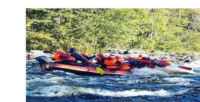 Koskenlasku mahtavasti ”pamahtelevassa” seurassa, meloen tai puuveneessä kyydissä istuen (pelastusliivit, sadeviitta tms. halutessaan).