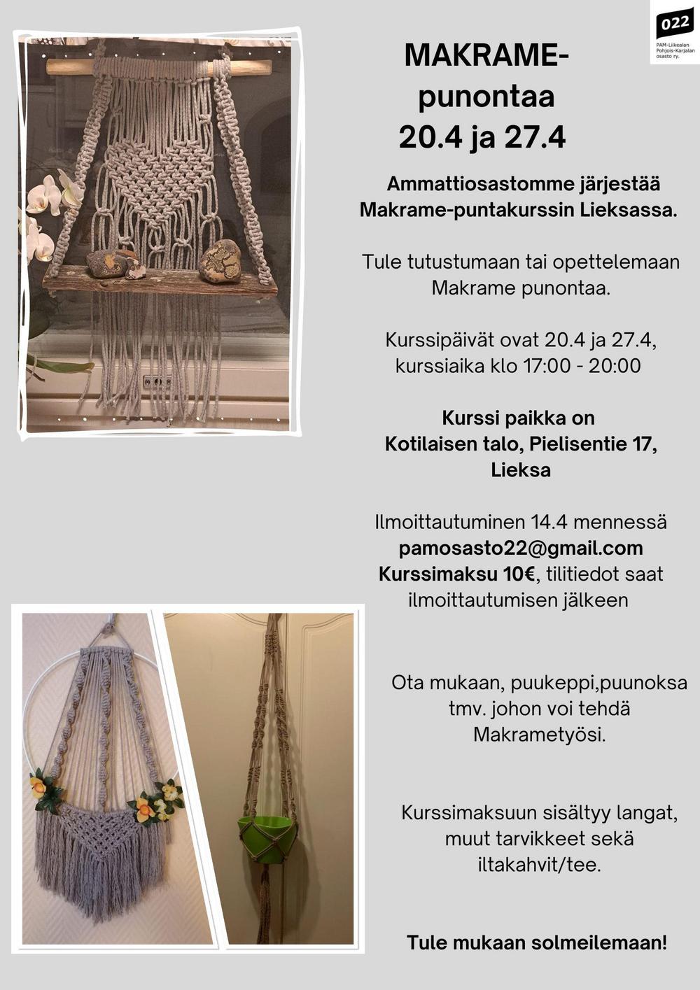 HUOM! Ota mukaan puukeppi, puunoksa tmv. johon voit tehdä Makrame-työsi