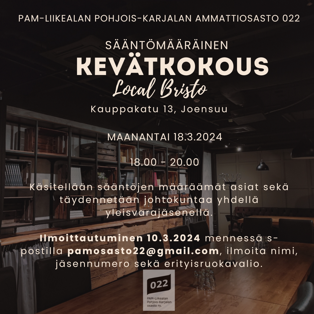 Sääntömääräinen kevätkokous 18.3.2024 klo 18.00, ravintola Local Bistro, Kauppakatu 32, Joensuu.