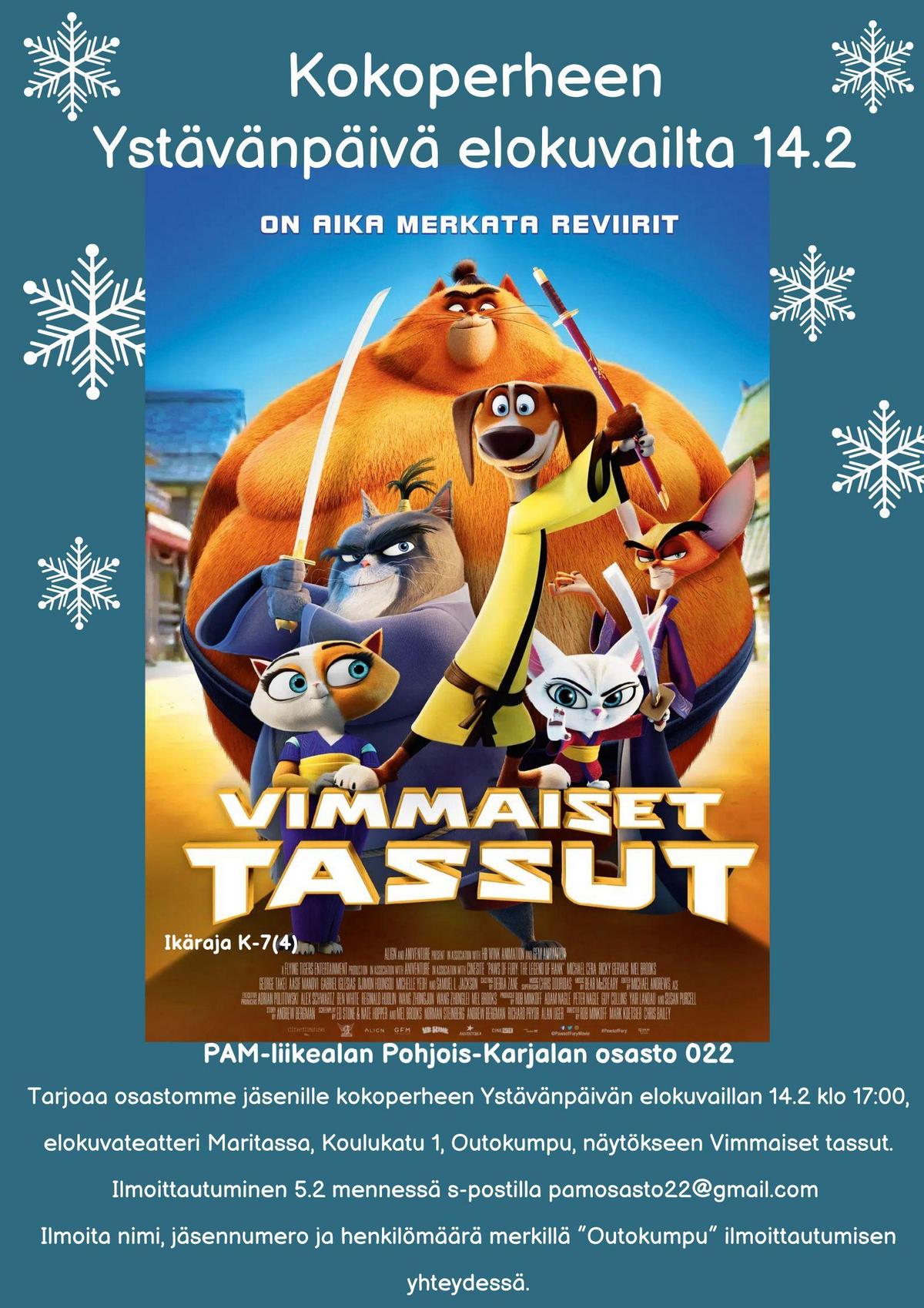 Tarjoaa osastomme jäsenille kokoperheen Ystävänpäivän elokuvaillan 14.2 klo 17:00, elokuvateatteri Maritassa, Koulukatu 1, Outokumpu, näytökseen Vimmaiset tassut.
